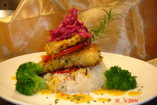 作法:1.先將鯛魚切成二塊依約沾上麵粉~蛋液~香料粉入鍋煎至表面上色